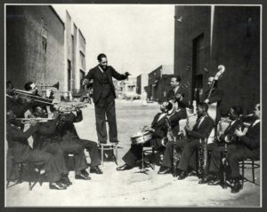 Widely recognized as a major composer of the Twentieth century, Duke Ellington’s orchestra was, to many, the greatest jazz ensemble in history. This 1930 image shows Ellington on a Hollywood set, rehearsing his band for the two numbers on the recording at left.