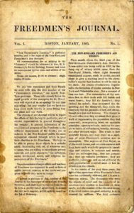 Inaugural issue of The Freedmen’s Journal has a front page description of the New England Freedmen’s Aid Society, and the great amount of work it has accomplished attempting to house, feed, clothe, reorient, and educate the ever-growing number of freed slaves in the South.