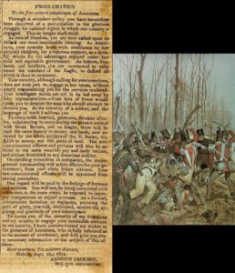 The future president, outnumbered and facing a flotilla of British troops, issues a “Proclamation” from Mobile, AL, “To the free colored inhabitants of Louisiana…to rally around the standard of the Eagle.” 450 men of color responded and their two battalions significantly helped repulse the British assault in the Battle of New Orleans. Jackson extolled, “Natives of different states, acting together, for the first time in this camp … reaped the fruits of an honorable union.”