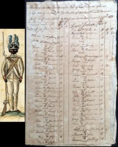 French Sous-lieutenant Jean-Baptiste-Antoine DeVerger, who also participated in the battle, afterwards made a watercolor sketch of four soldiers from various units titled, “American soldiers at the siege of Yorktown, 1781,” (Brown University Archives). Above left, standing at attention is the one he depicted from the then-famous Black Regiment.