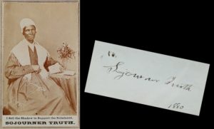 Among several versions, this 1864 Carte-de-Visite, at left, declares “I sell the shadow to support the substance.” Sojourner’s six editions of The Narrative of Sojourner Truth: A Northern Slave (1850), also provided funds for her traveling lectures contending slavery over the course of a 30-year speaking career.