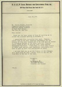 Above, writing on his N.A.A.C.P. Legal Defense and Educational Fund letterhead in 1955, the victorious Civil Rights attorney declines a speaking invitation due to his involvement with the pending and increasing numbers of school desegregation cases following the Brown v. Board of Education Supreme Court Decision the previous year.