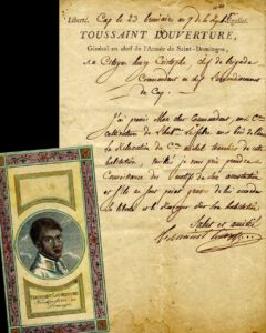 Dated the 23rd of Brumaire [November 14, 1798] in the seventh year of the French Revolution, this signed letter between two great revolutionary leaders is doubly scarce in being penned entirely by Toussaint. Written in French, he refers to the release of a citizen in Chistophe’s once elegant capital-city district of Le Cap (Cap-Haitien), in the North, and asks the General to inquire into the situation and let the man return to his plantation if the reasons for his arrest were not serious.